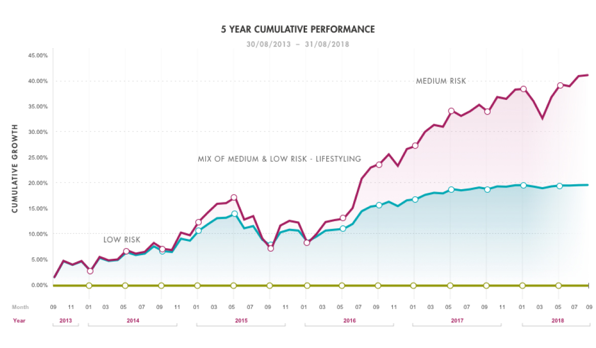 This example shows the performance of low and medium risk funds over 5 years compared to lifestyle switching.